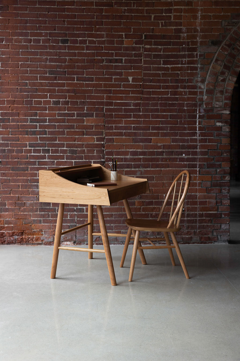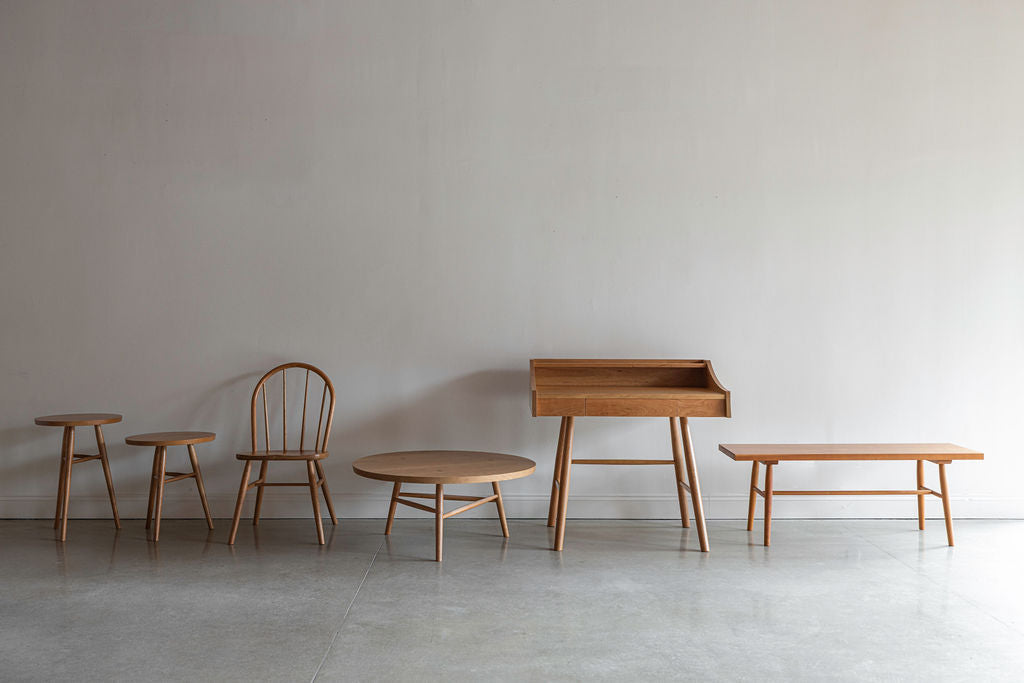 Hudson introduces cylindrical elements to traditional New England furniture forms. Turned legs and stretchers echo throughout the collection, creating a shared design language.